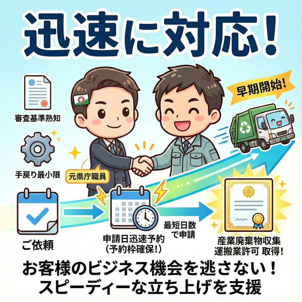 多くの自治体では、産業廃棄物収集運搬業許可の申請日が事前予約制となっており予約枠が埋まりやすい状況です。そのため、迅速な手続きは収集運搬業務の早期開始に直結します。当事務所では、お客様のビジネス機会を逃さないよう、スピーディーな収集運搬事業の立ち上げを支援します。また、書類作成においても、行政の審査基準を熟知した元県庁職員が担当するため、手戻りを最小限に抑え、収集運搬許可取得までの時間を短縮します。