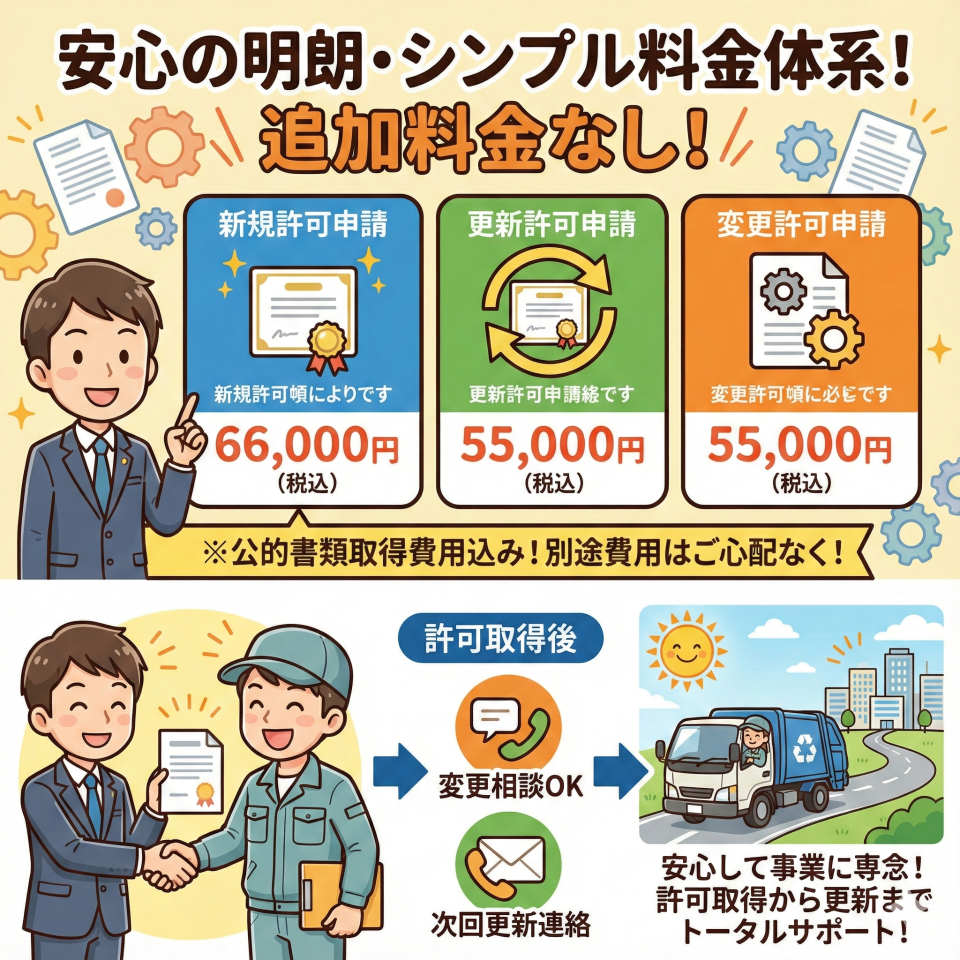 産業廃棄物収集運搬業許可申請の場合、新規許可申請、更新許可申請、変更許可申請それぞれについて、明確な報酬額を設定しており許可申請に際して追加料金が発生するようなことはございません。