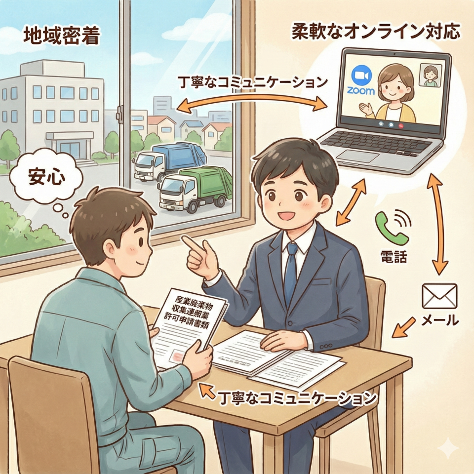 許可申請の手続きに不安を感じる方も多いと思います。当事務所では、お客様の安心のため、収集運搬業の許可申請や各種届出において、できる限り直接お伺いして面談やご説明を行っております。地域密着型のサービスを重視し、お客様の疑問や不安に寄り添い、丁寧なコミュニケーションを心がけています。対面でのご相談が難しい場合でも、ご希望に応じて、電話・メール・Zoomなどによるオンライン対応も柔軟に承っております。特に、産業廃棄物収集運搬業の許可申請においては、自治体ごとの細かな要件や書類の準備に専門的な知識が求められます。当事務所の元県庁職員の経験を活かし、お客様が安心して手続きを進められるよう、Face to Faceのコミュニケーションを大切にしています。