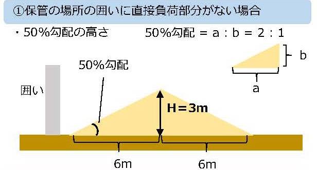 一 保管の場所の囲いに直接負荷部分(保管物の荷重が直接かかる構造である部分をいう。以下この条において同じ。)がない場合(第三号に掲げる場合を除く。) 当該保管の場所の任意の点ごとに、地盤面から、当該点を通る鉛直線と当該保管の場所の囲いの下端(当該下端が地盤面に接していない場合にあっては、当該下端を鉛直方向に延長した面と地盤面との交線)を通り水平面に対し上方に五十パーセントの勾配を有する面との交点(当該交点が二以上ある場合にあっては、最も地盤面に近いもの)までの高さ