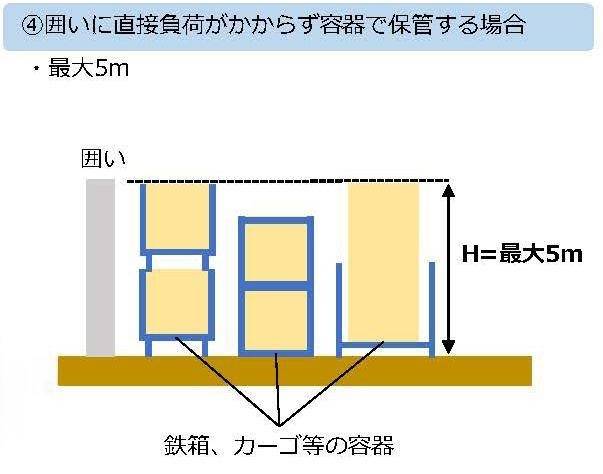 一 保管の場所の囲いに直接負荷部分がない場合(第三号に掲げる場合を除く。) 前項第一号に規定する高さ又は五メートルのうちいずれか低いもの